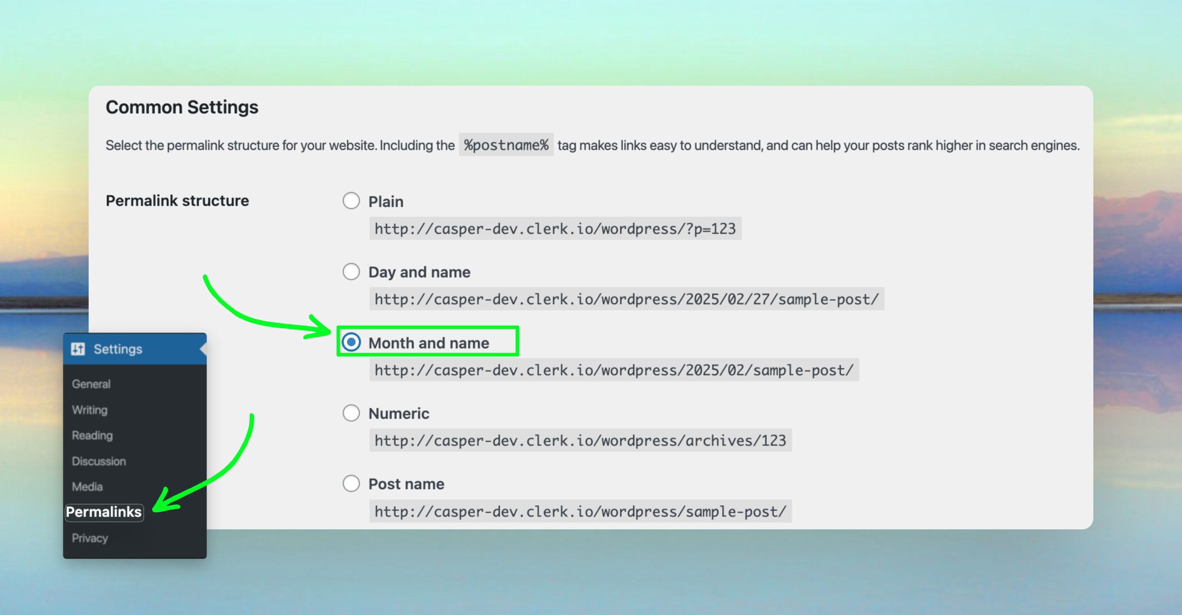 Si aún no sincroniza, ve al backend de WooCommerce, luego a Settings > Permalinks y cambia la opción de Common Settings a Month and name y presiona Guardar cambios: