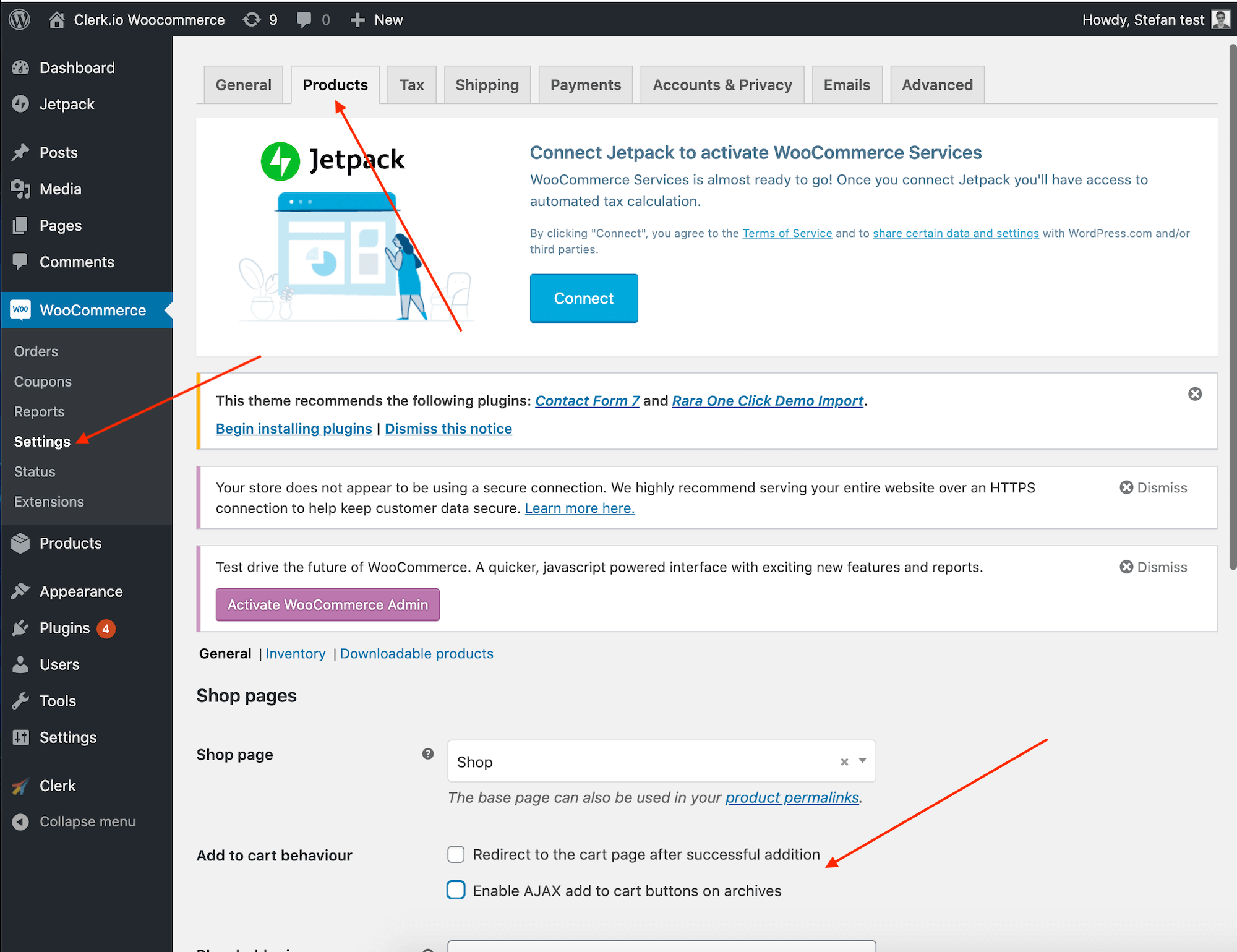 Asegúrate de haber instalado el Plugin correctamente y que está activado. Si actualizaste recientemente el plugin automáticamente, WooCommerce a veces desactiva el plugin. Si esto sucedió, ve a Plugins > Clerk y haz clic en Activar.