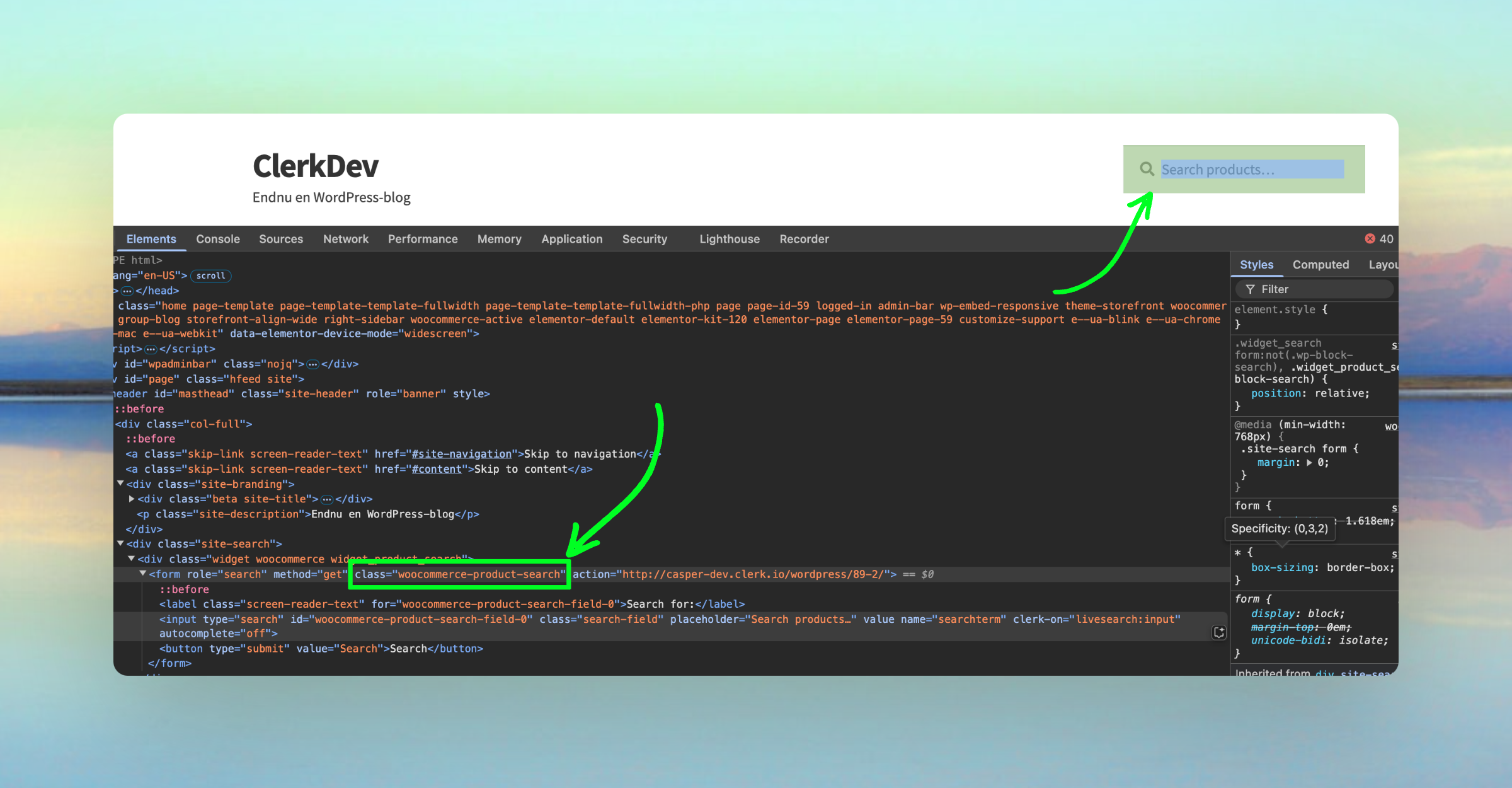 <form>, debe coincidir con el nombre de la página que creaste en WooCommerce. Generalmente será"soegeresultater"o"search-results".El atributo
