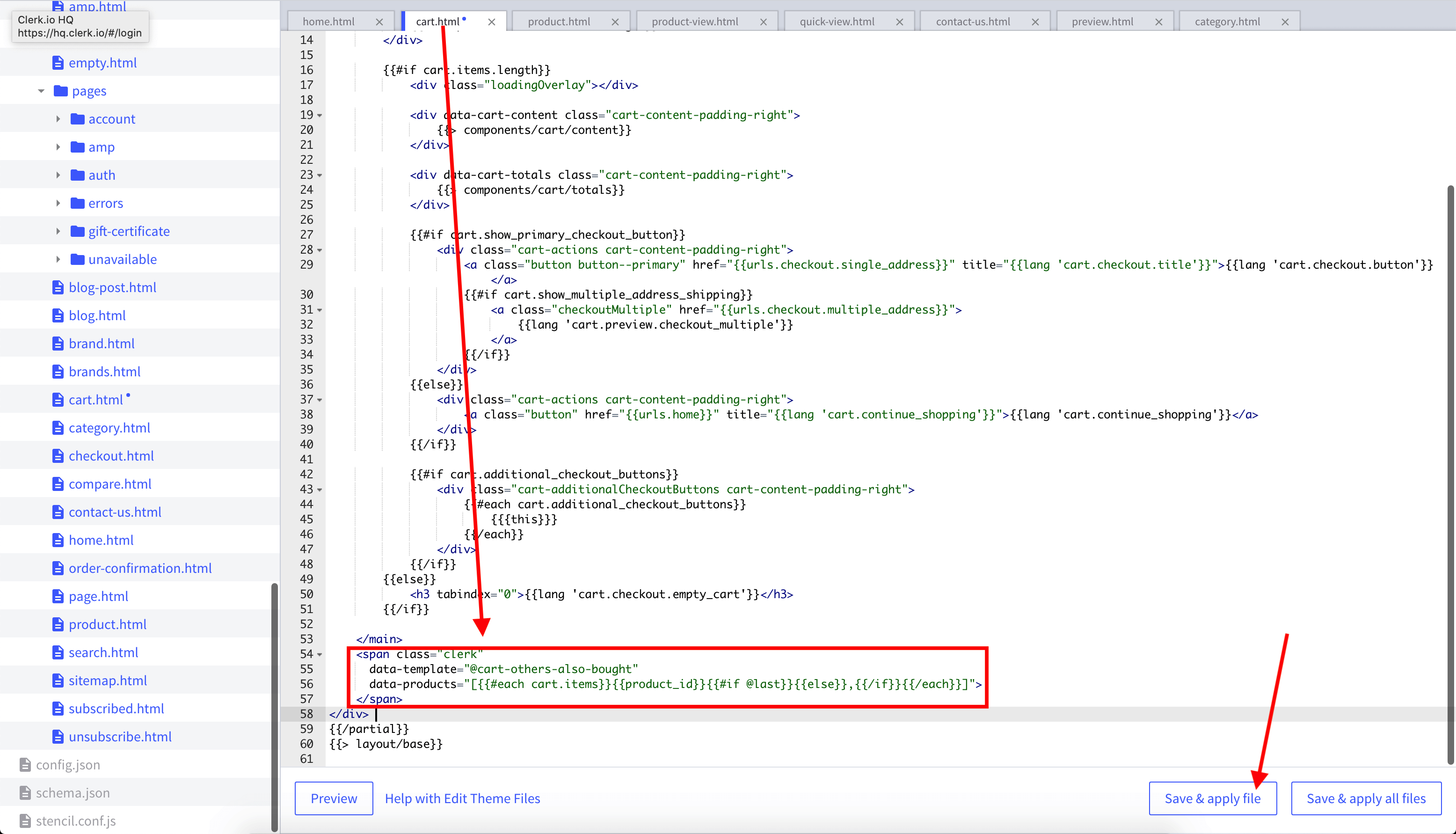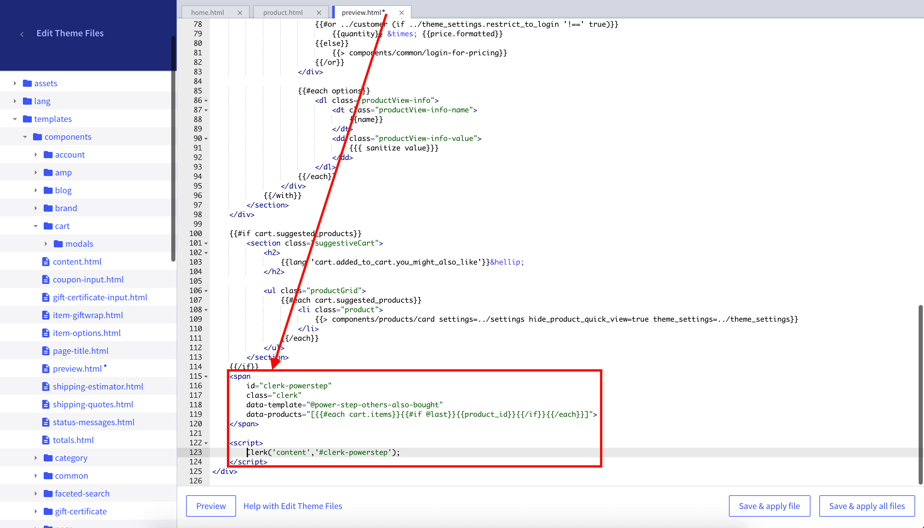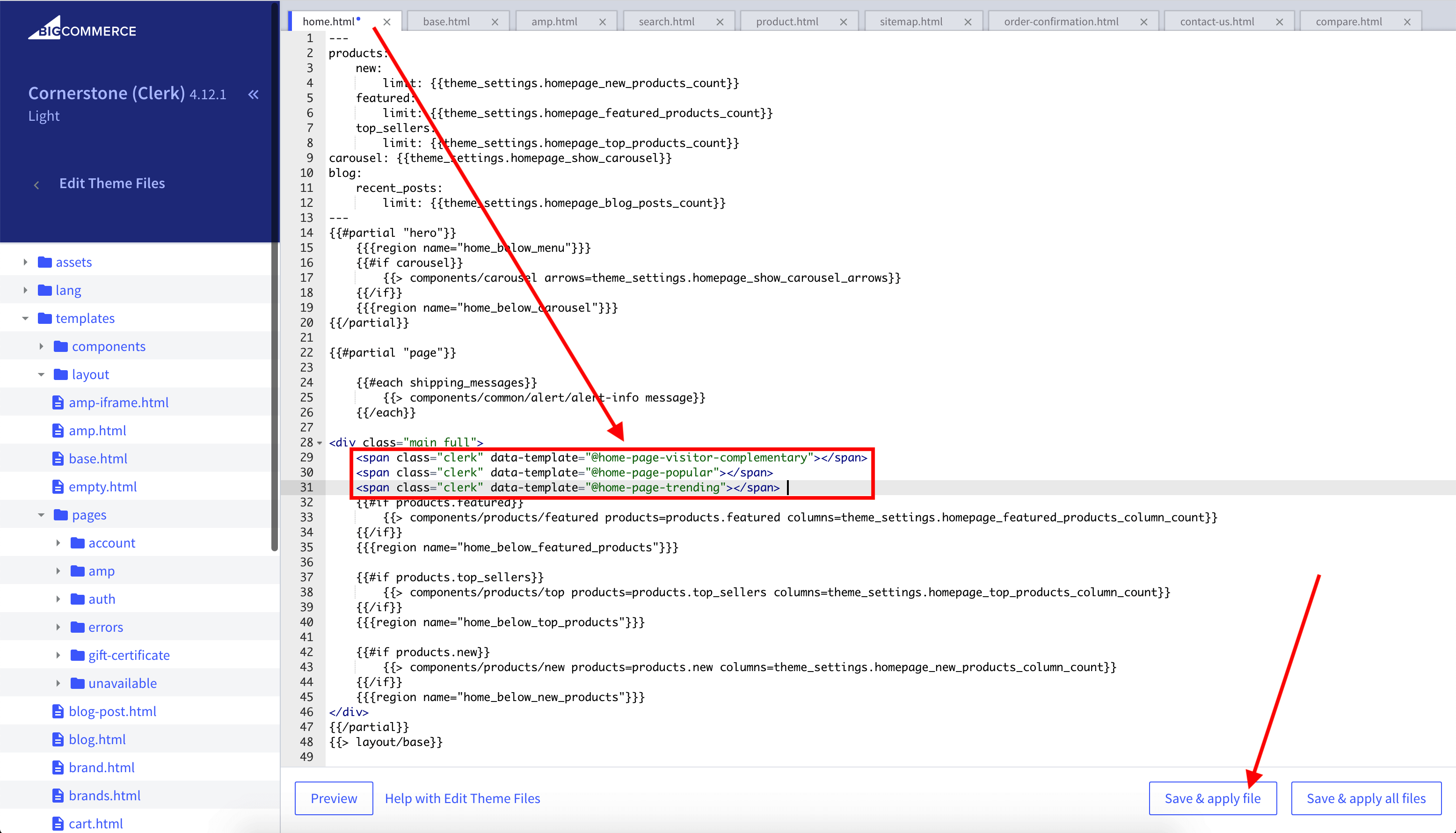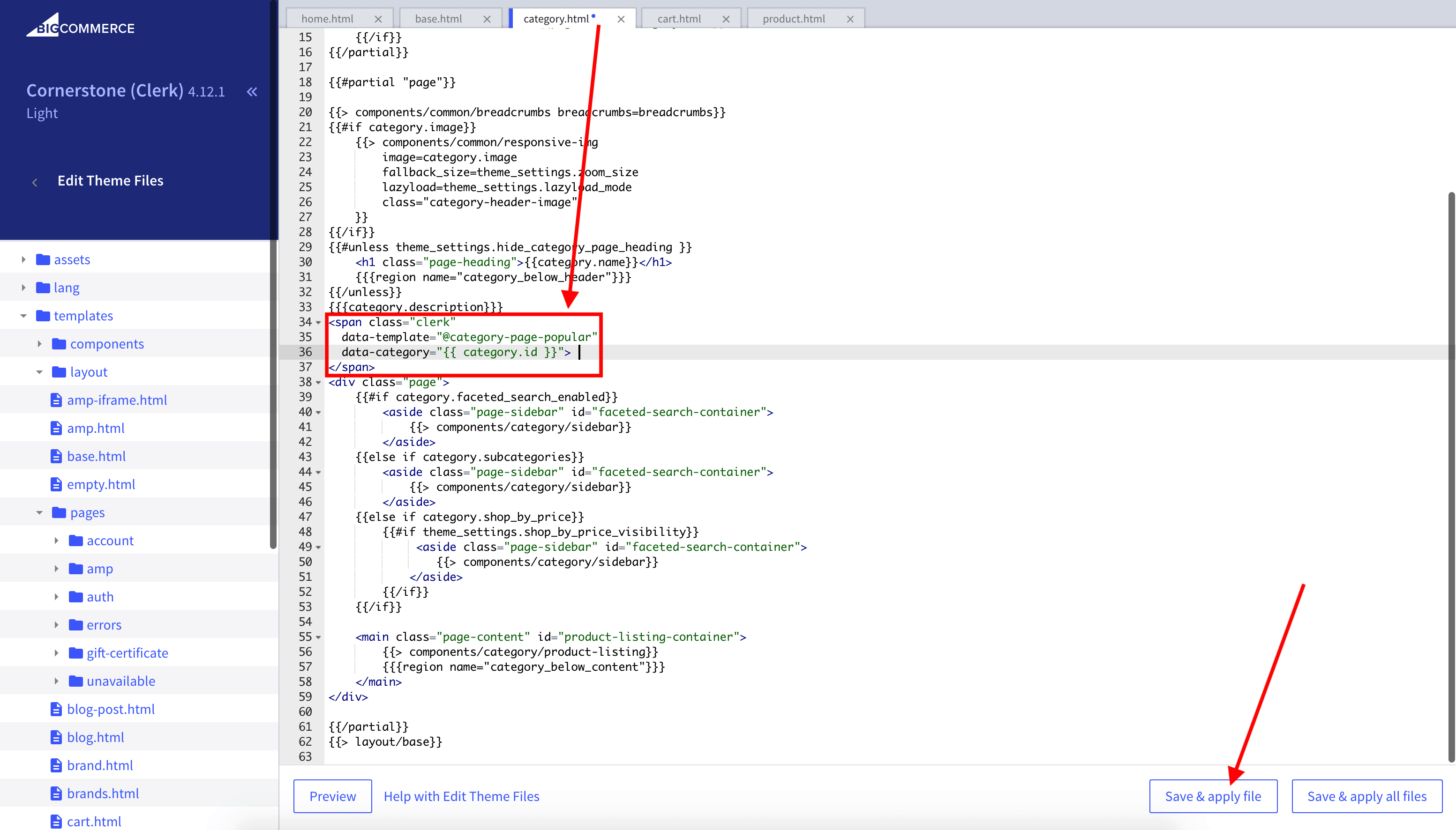 - In BigCommerce go to Storefront > My Themes > Advanced > Edit Theme Files.