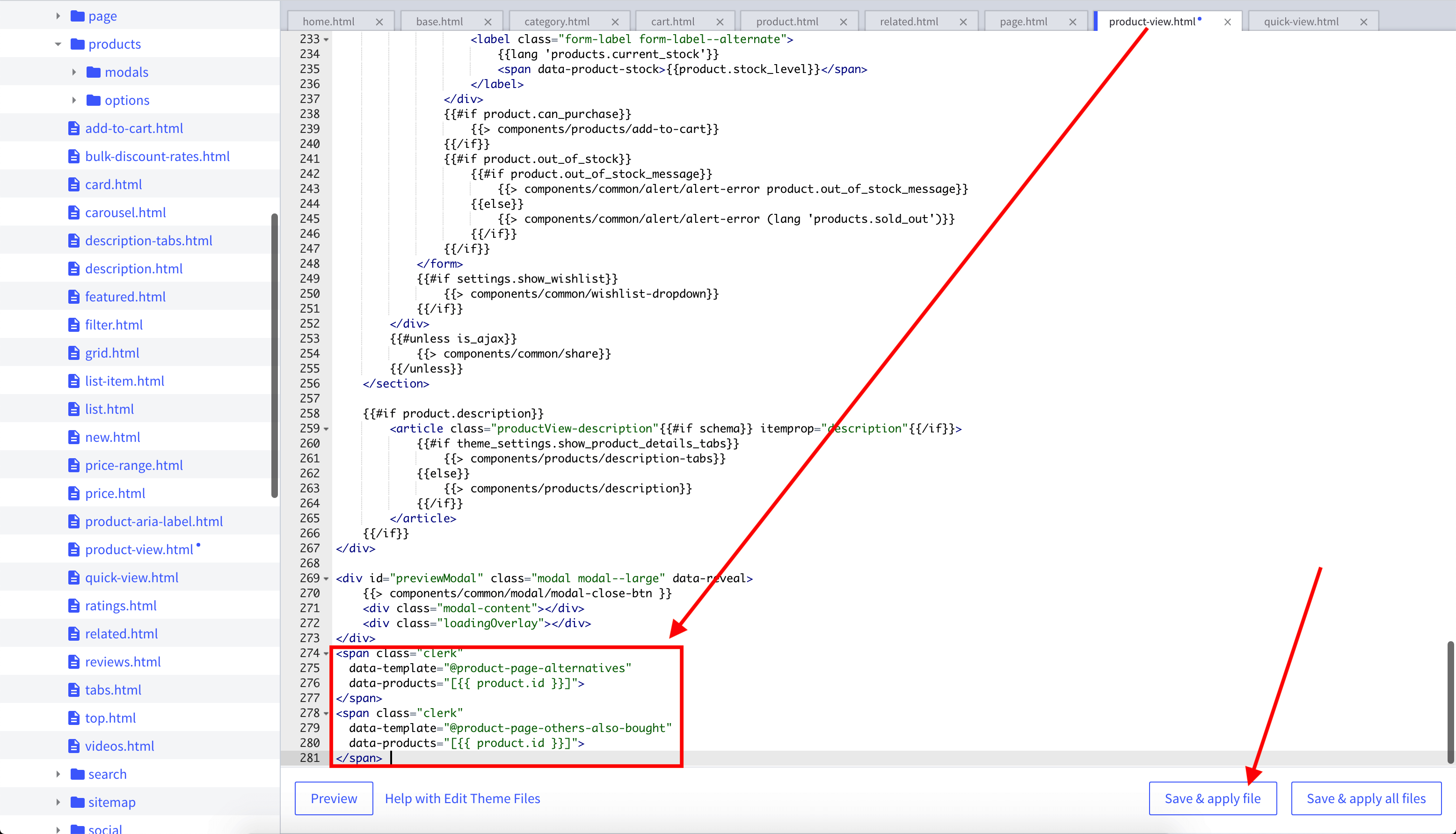- Open the file that generates your product pages, often under templates > components (e.g.