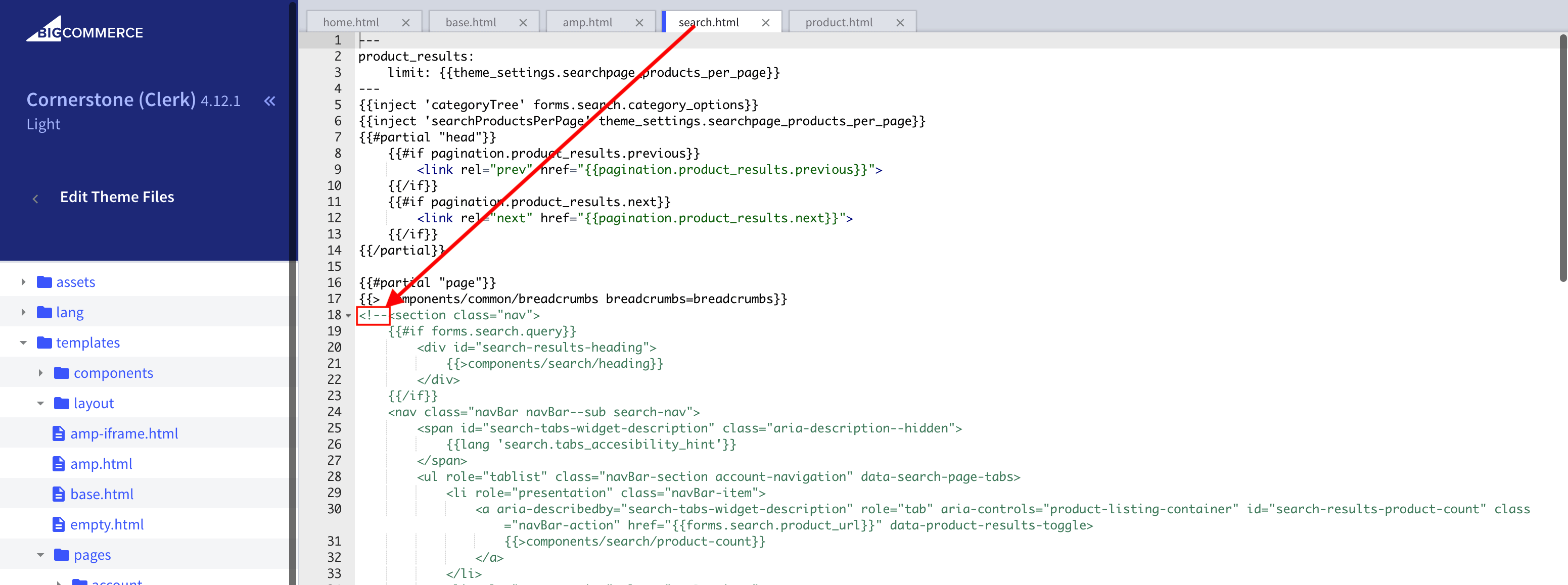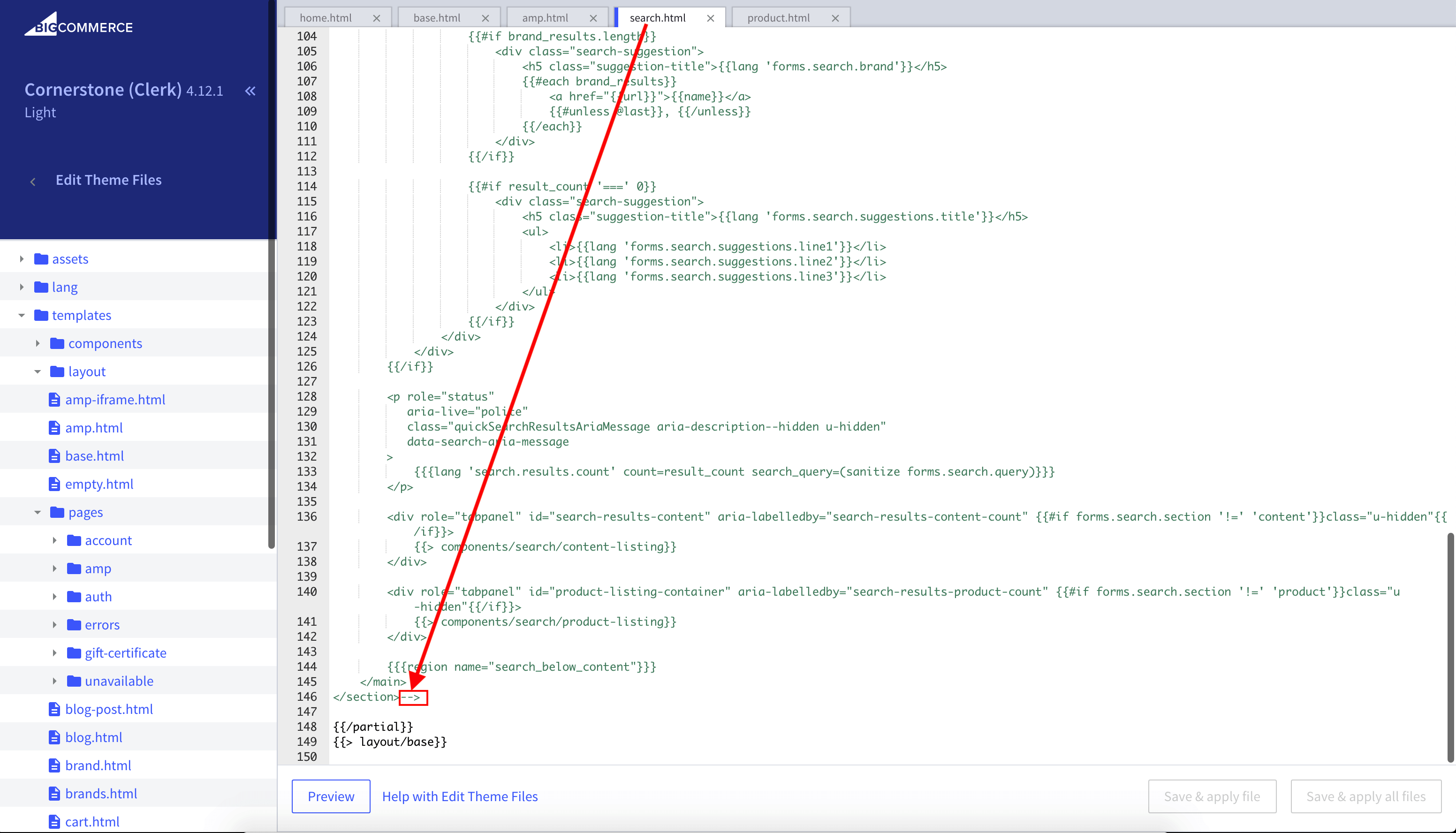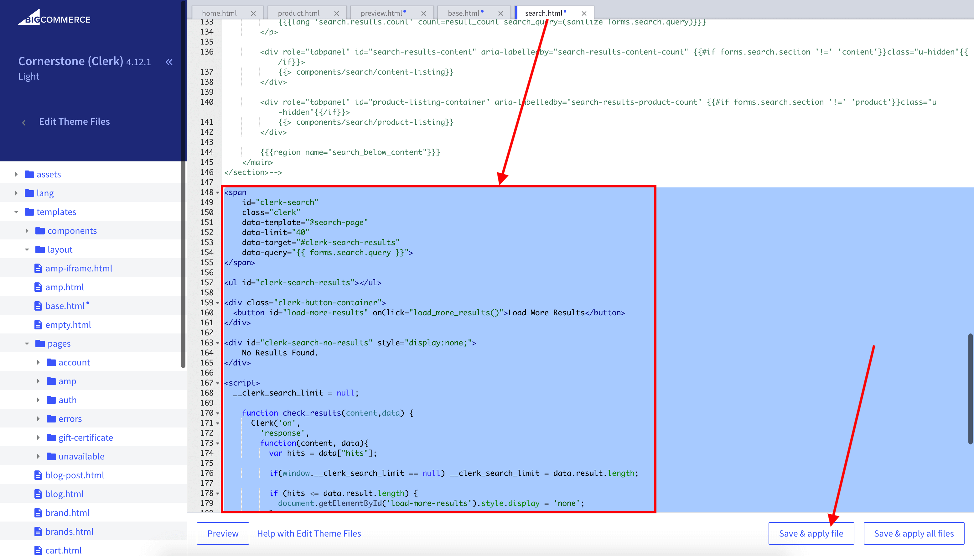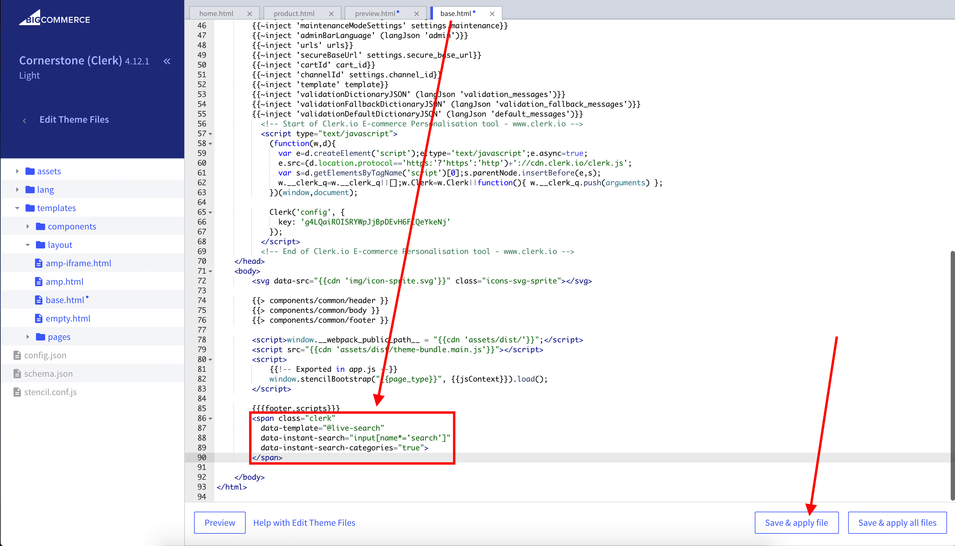 - In BigCommerce go to Storefront > My Themes > Advanced > Edit Theme Files.