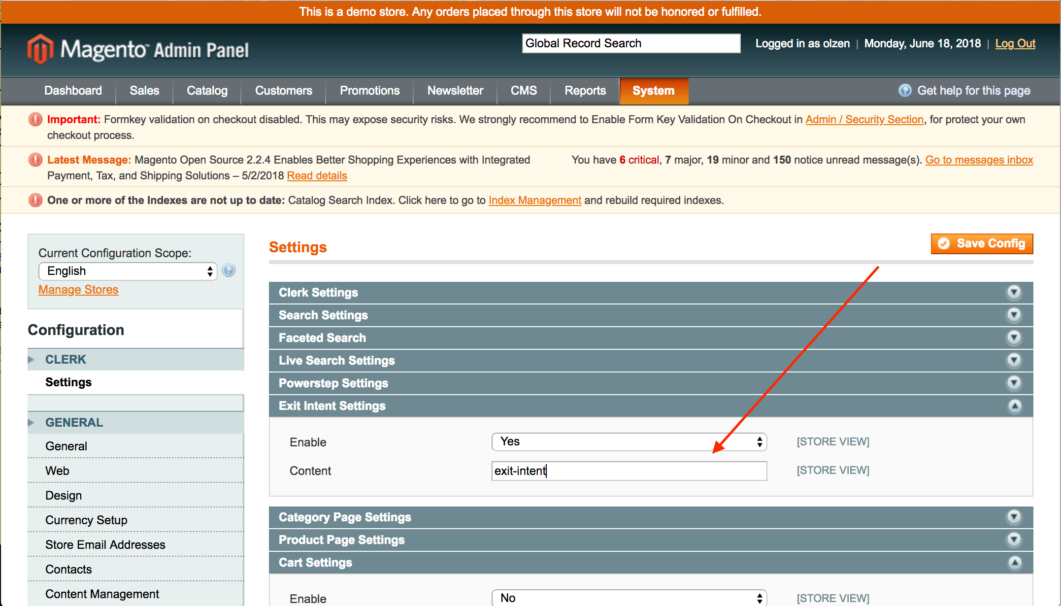 - In Magento, go to System > Configuration > Clerk settings and choose the correct Store View.