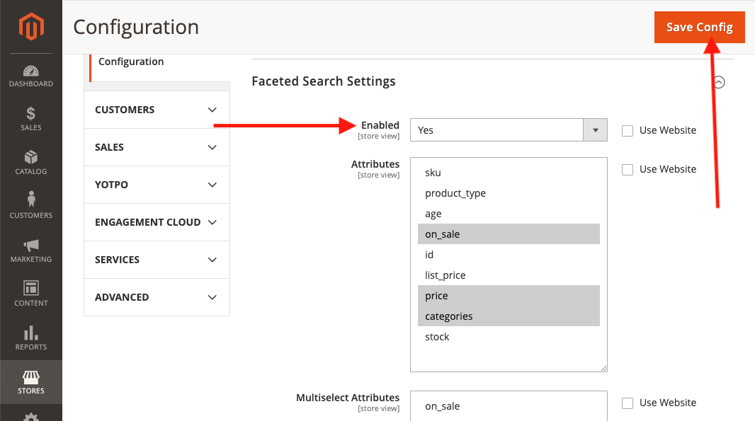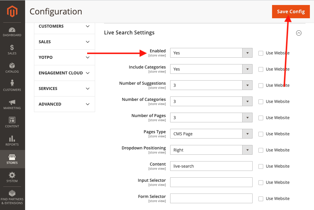 To enable Search features, use the Magento extension settings: Stores > Configuration > Clerk > Settings. To add sync details or start a sync, go to my.clerk.io > Data > Configuration.