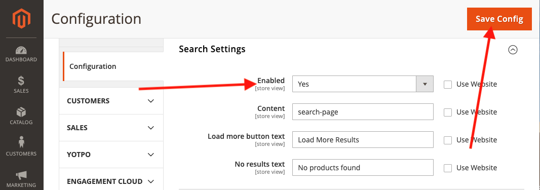 - Under Search Settings set Enabled to Yes and click Save Config.